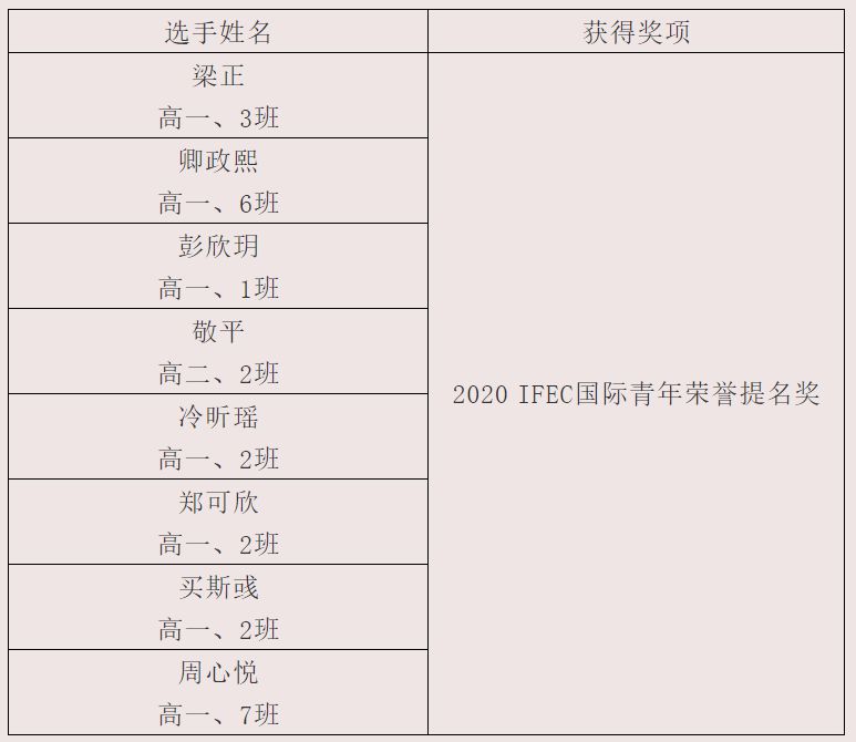 在本次世界青年外交使者大赛(IFEC)中,我校共9人斩获殊荣。其中获得2020IFEC国际青年荣誉提名奖的同学共计8人,2020IFEC青年大使(文化科技体育)的同学1人。