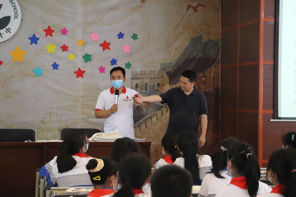 红十字会专家通过理论讲授、现场演示、实践操作等方式,用近年来发生在身边的鲜活事例,通过播放幻灯片,展示实物、现场演示等形式,向同学们强调了应急救护“黄金四分钟”的重要性,随后逐一讲解了胸外按压、人工呼吸、止血巾包扎等方法,向全体师生普及了日常急救知识。