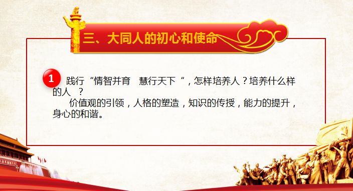 他分别从我们党、教育人、大同人三个层面阐述了“初心与使命”的深刻内涵,强调了对当前教育“培养什么样的人、为谁培养人、怎样培养人”三大问题的理解,引领全体与会同志重温了二十中人的教育初心。